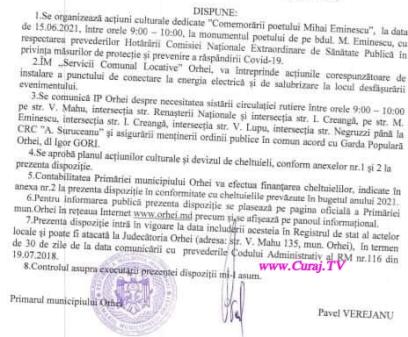 Vreau să vă relatez încălcările admise de către Partidul Șor în campania electorală. La ziua comemorării marelui poet Mihai Eminescu (pe 15 iunie 2021), aceștia au depus flori pe care era panglica „Partidul Șor”, însă acestea au fost procurate de primărie, fiind alocați 2.000 MDL din bugetul Primăriei Orhei. Drept dovadă anexez devizul de cheltuieli pentru acest eveniment.