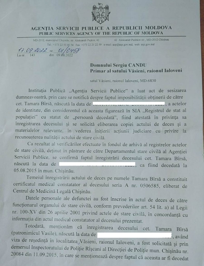Am vorbit cu primarul de Vasieni, d.Sergiu Candu, sa trimită o scrisoare de restabilire a actelor la Starea Civila Chisinau si mai jos va atasez raspunsul primit.